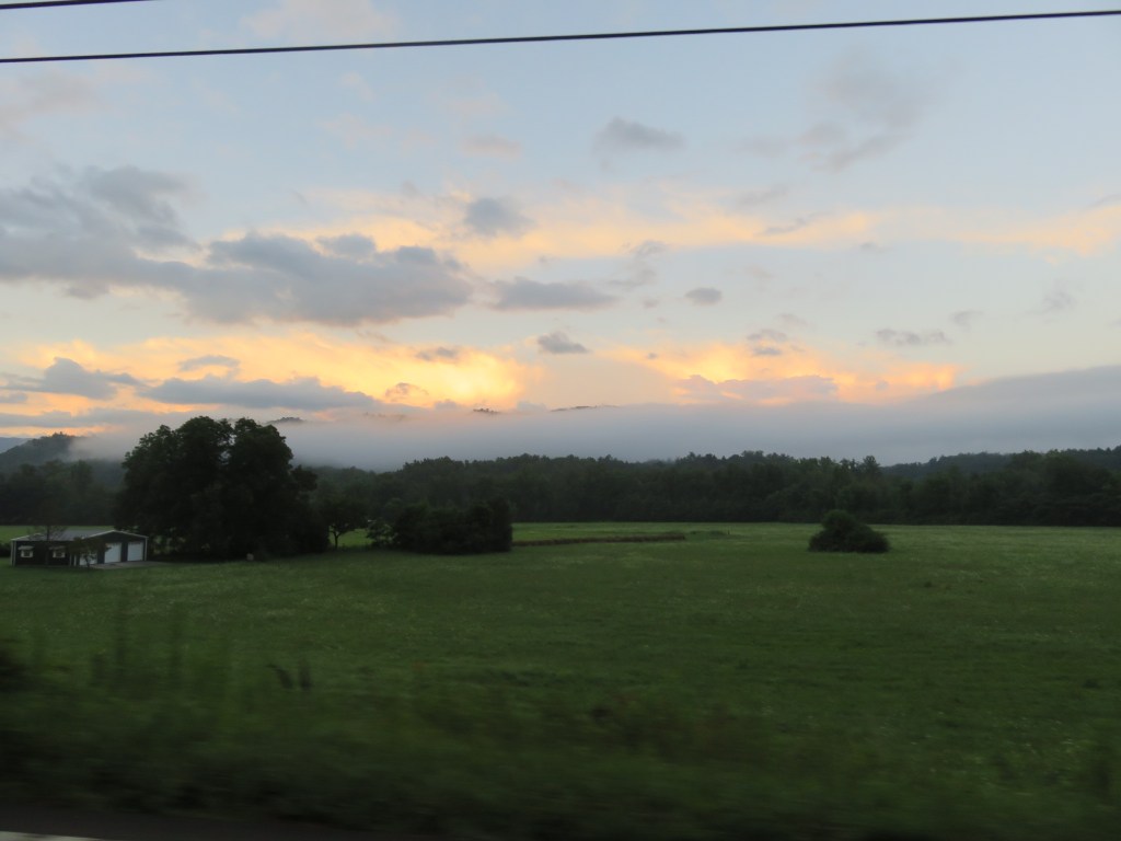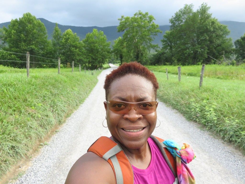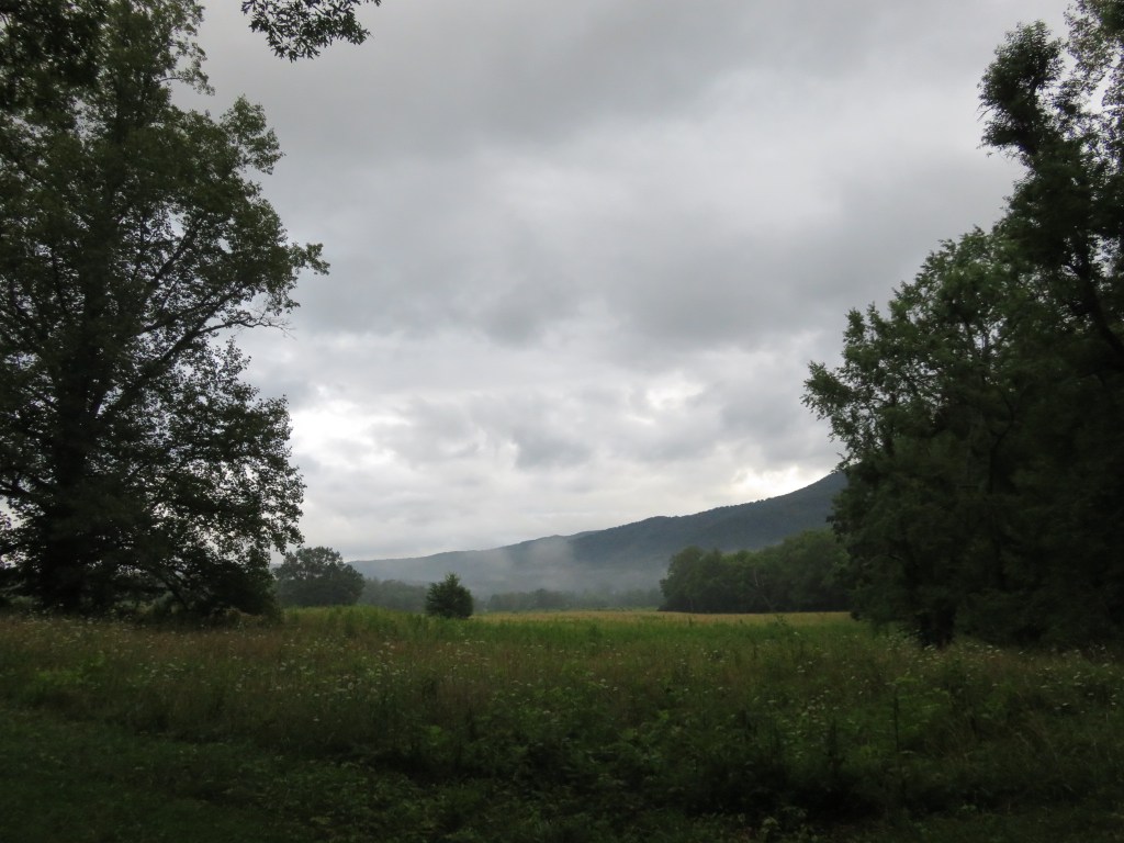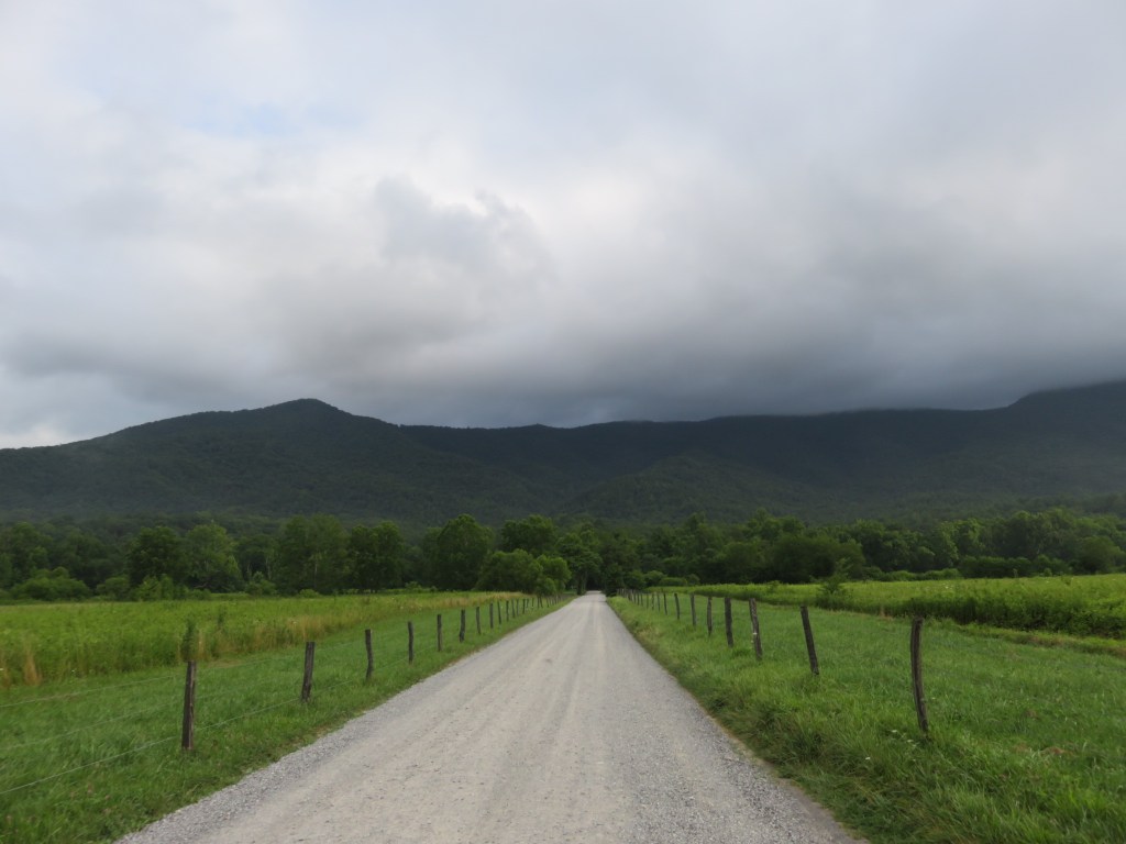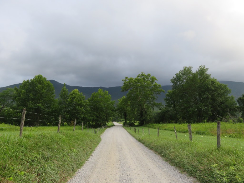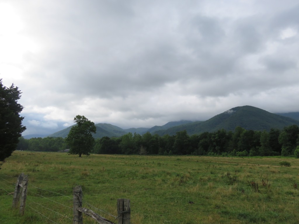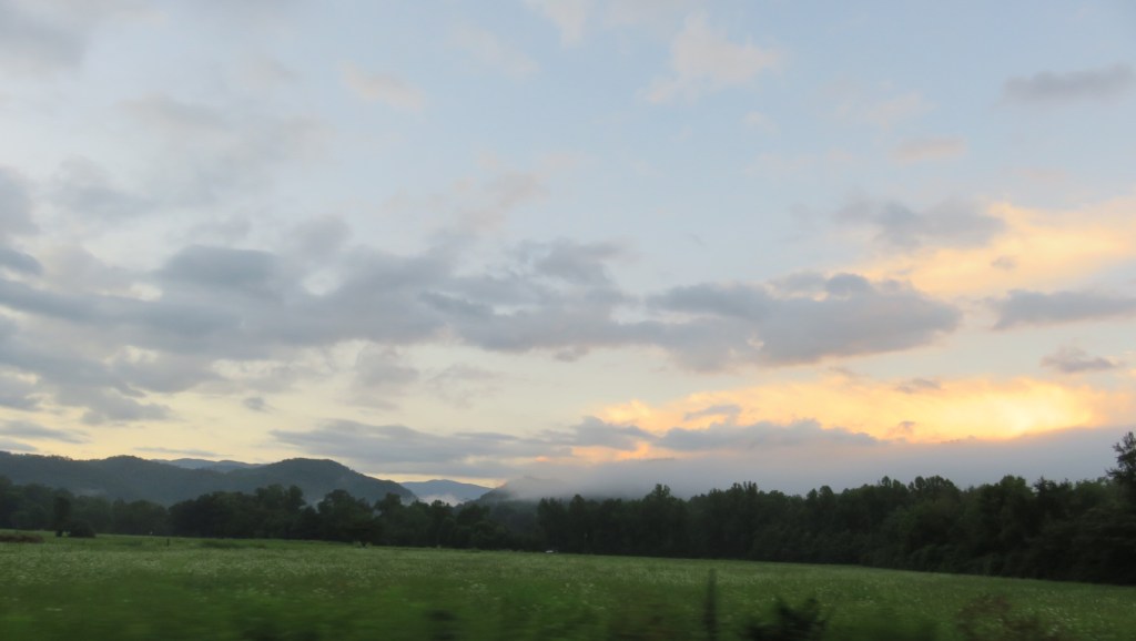 Today I hiked alone in Cades Cove in the Great Smoky Mountains National Park because my group was doing a bike ride. Having not ridden a bike in many years, I decided not to because broken or bruised body parts is not my idea of a great vacation. However, although I didn’t ride with them I left the house with them, lonnnng before the crack of dawn so they could get to Cades Cove early enough to rent bikes. The upside was the sight of the sun rising behind the mountains.