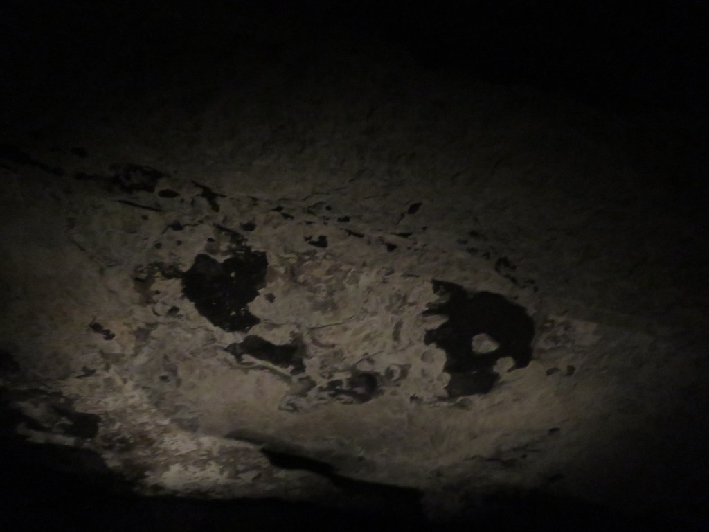 In the Star Chamber, the gypsum coating the ceiling is blackened from soot/smoke from torches, lanterns and fires, but there are spots of white that from the right perspective gives the appearance of stars. These stars were either created by guides and visitors bouncing rocks off the ceiling and chipping the soot to expose the gypsum or new crystals pushing through the soot covered layer. Perhaps they were created through a combination of the two. On the ceiling of Star Chamber one can also see the moon and the milky way.