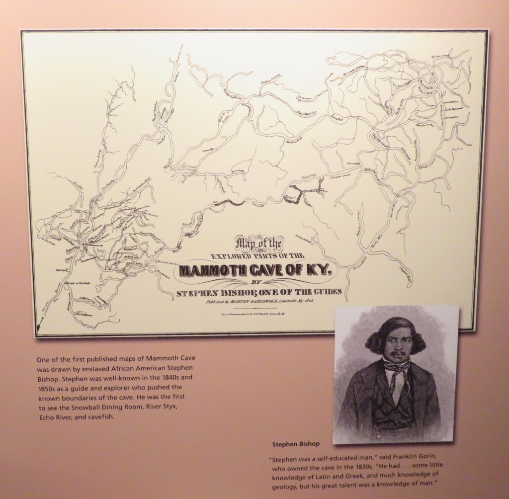 Stephen Bishop was the first to cross the Bottomless Pit (105 ft. deep) and is known for notable discoveries like Fatman’s Misery, Tall Man’s Misery, Great Relief Hall and Mammoth Dome. He also made a map of the cave from memory which was published in the 1840s and continued to be used until the 1880s (Lanzendorfer, 2019; Medley Lyons, 2006; NPS, n.d.). Bishop started guiding around 1838 while enslaved, gained his freedom in 1856, and died one year later at the young age of 37. Such was his reputation as a guide that it is said that for years after his death, the cave’s owner continued to have a guide called ‘Stephen Bishop’ to keep attracting visitors to the cave (anon). His remains are now interred at the Old Guide’s Cemetery at Mammoth Cave National Park (NPS, n.d.).