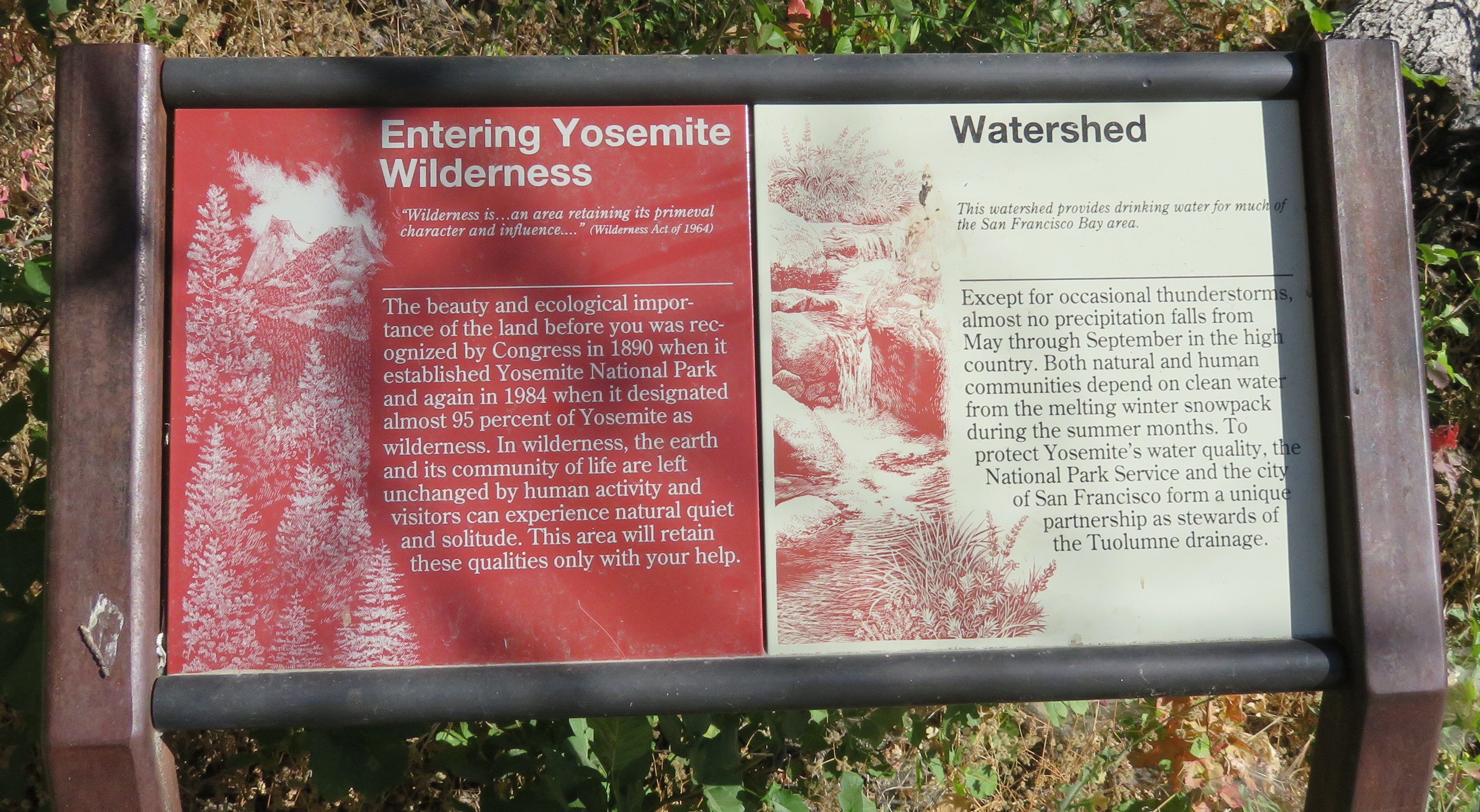 Over 95% of Yosemite is designated as ‘wilderness’ under the federal Wilderness Act of 1964 (NPS, 2017). According to the Wilderness Act a ‘wilderness’ is “in contrast with those areas where man and his own works dominate the landscape … an area where the earth and its community of life are untrammeled by man, where man himself is a visitor who does not remain … an area of undeveloped Federal land retaining its primeval character and influence, without permanent improvements or human habitation, which is protected and managed so as to preserve its natural conditions and which (1) generally appears to have been affected primarily by the forces of nature, with the imprint of man’s work substantially unnoticeable; (2) has outstanding opportunities for solitude or a primitive and unconfined type of recreation; (3) has at least five thousand acres of land or is of sufficient size as to make practicable its preservation and use in an unimpaired condition; and (4) may also contain ecological, geological, or other features of scientific, educational, scenic, or historical value” (Section 2.c.). California also has its own wilderness act, the California Wilderness Act, which was passed in 1984. While day hiking is allowed without special permission, permits are required to stay in wilderness areas overnight.