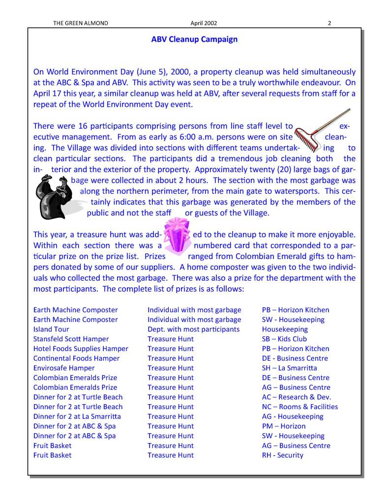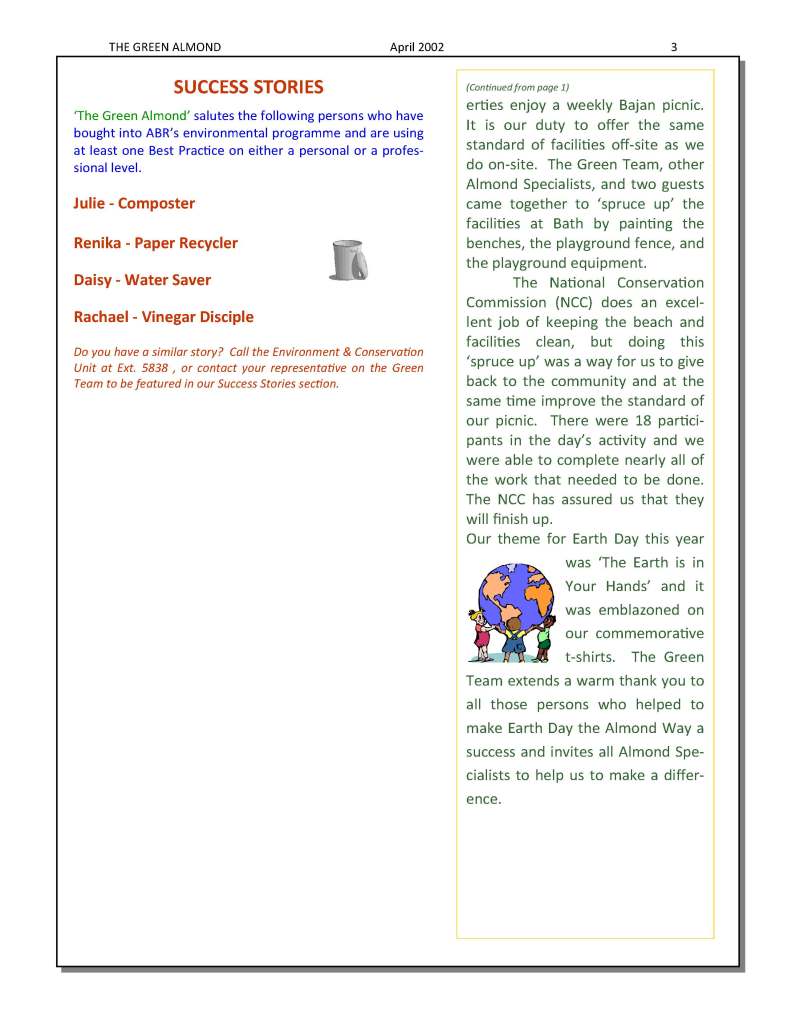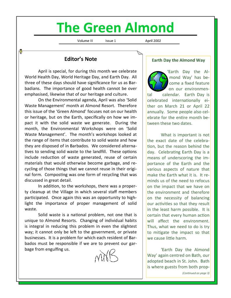 Writing has forever been one of my joys. Whether it was my small college newspaper or the Green Almond Newsletter. I started the Green Almond as another strategy to raise awareness about our greening efforts – to share the same information with everyone, remind us of upcoming events, recognize individuals and departments, call for volunteers, etc.. I even ran competitions through the newsletter and awarded good prizes to winners. Since most of the time I was the environmental unit (there was a short period when my friend Rohan worked with me), it took a lot of effort to put the newsletter together, print it, and distribute it. There were times when I worked on property from 7 am or 8 am (yes me) until 11 pm at night, because I had other responsibilities like being the Manager on Duty, but it was worth it.