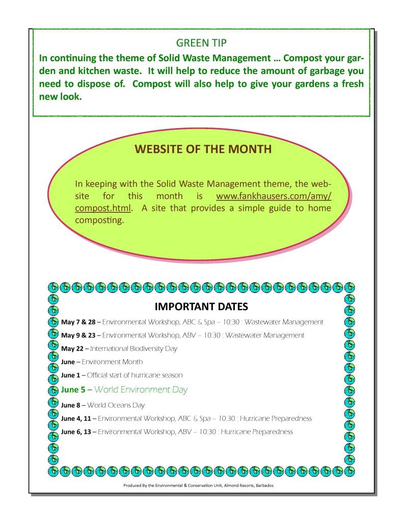 The WED Exhibition was another opportunity to help our internal and external community members increase their understanding of environmental impacts and what we could all do to improve them. Held on June 5th, it was hosted at the Almond Beach Village and promoted internally and in our wider community. Attendees were employees and guests from both properties, residents from our surrounding neighbourhoods, primary and secondary school children, other tourism stakeholders, friends and family. Exhibitors over several years included Barbados Gully Project, Barbados Sea Turtles Project, Central Emergency Relief Organisation (CERO), ‘Earth Force’ Eco Club from the secondary school nearby, Coastal Zone Management Unit, Springvale Indigenous Folk Museum, Sun Power (solar water heaters) and Treading Lightly. After the inaugural year, the exhibition was featured on the national calendar of events to celebrate environment month each June.