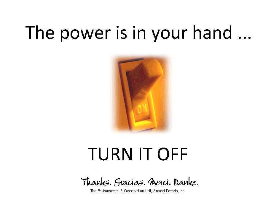I don’t remember what initiatives I started with, but the following are some easy to recall elements from my 6-year, multi-role, stint greening Almond Resorts Inc.