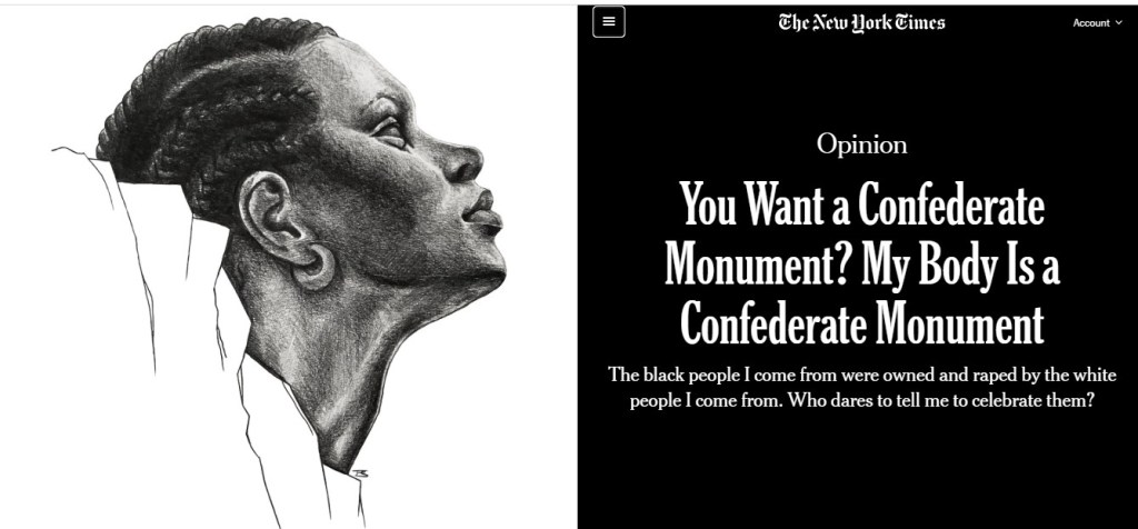 What a powerful statement. What an earth-shaking reminder. Stated so bluntly, it is a profound and necessary jolt to the system, a much needed whack to the psyche. This type of ‘monument’ is not a US phenomenon but the reality of former European colonies everywhere – a shared legacy of the descendants of formerly enslaved Africans in the ‘new world’ (where Columbus sailed the ocean blue in 1492) that many of us must grapple with on an ongoing basis.