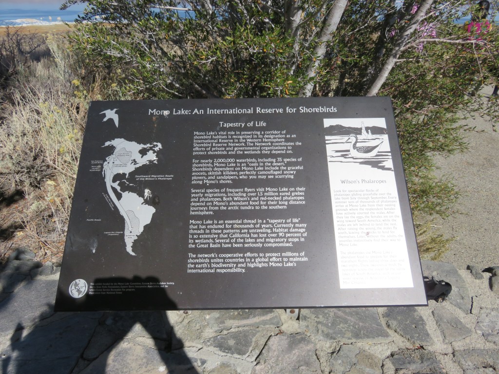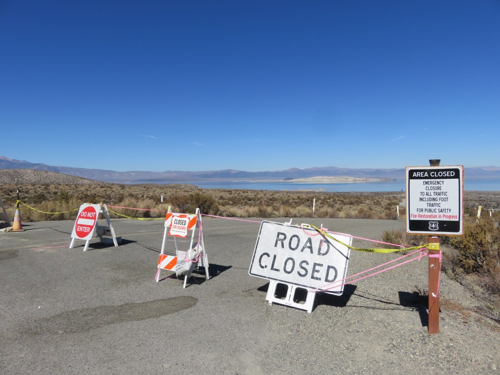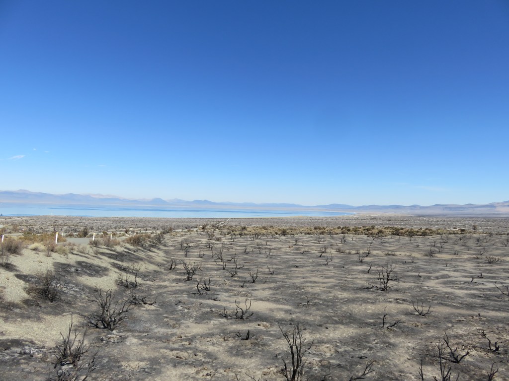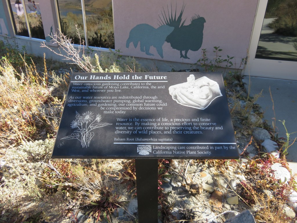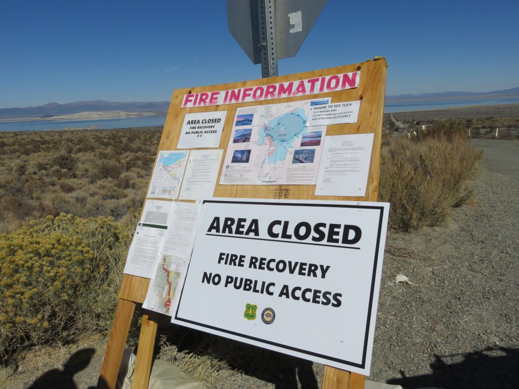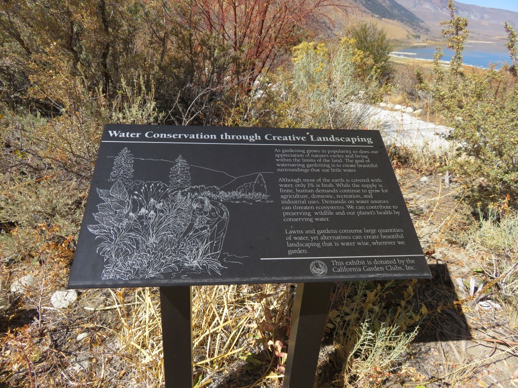Mono Lake is gorgeous, but we only spent a short time there because one of the areas we wanted to see was not accessible. In August this year a lightning strike started the Beach fire in the South Tufa Area of Mono Lake (InciWeb, 2020). At 3,780 acres, this was a small wildfire by California standards, but serious enough to damage a large part of the park. Since the fire, the South Tufa Area has been closed and no visitor access, even by foot, is allowed. We spent most of our time viewing the lake from outside the Visitor Center. The interpretation of the lake and native plants around the center is very well done.