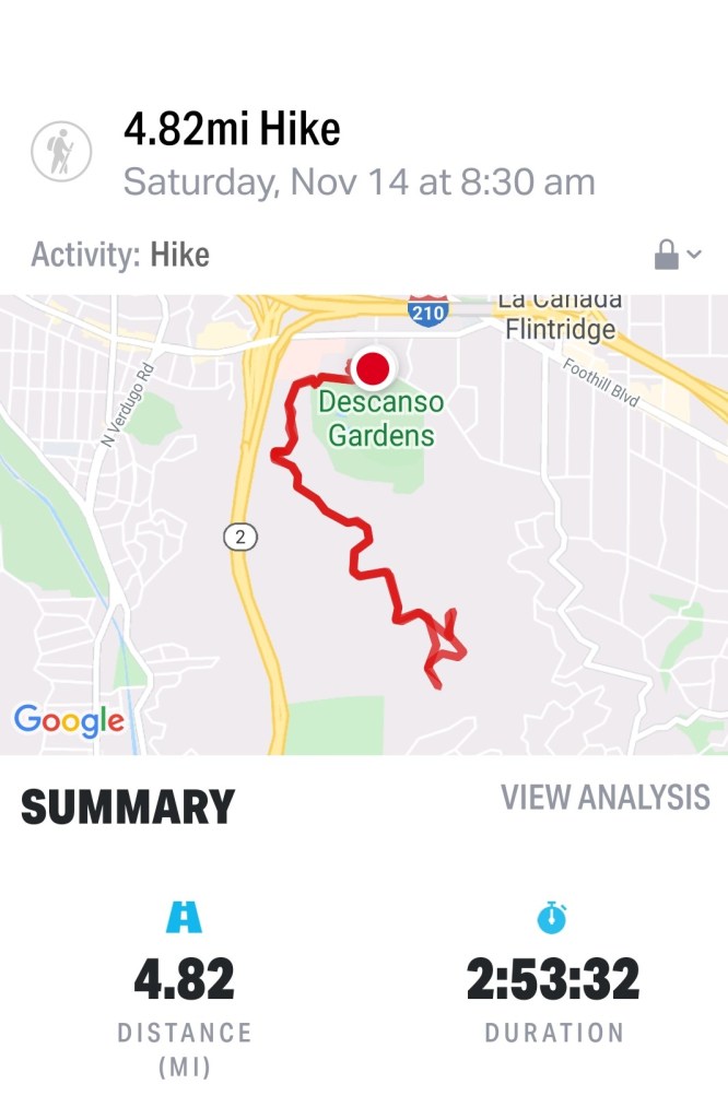 Nov 14 – Some challenging uphill intervals in 4.8 miles 🥾 of Descanso Trail and Cherry Canyon Fire Rd in Cherry Canyon Park. Only 24.8 miles to go. Next week, more 🏃🏾♀️ less 🚶🏾♀️.