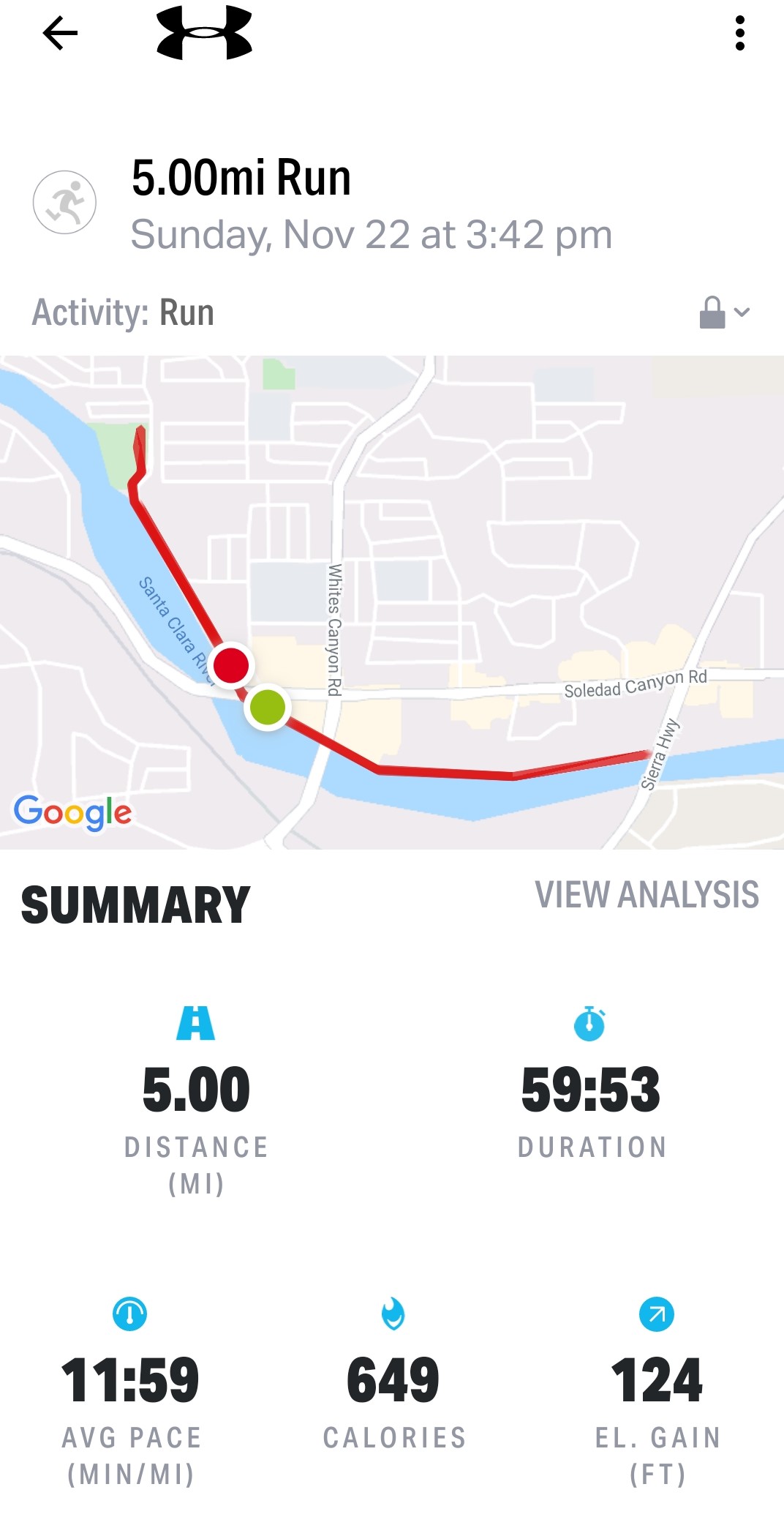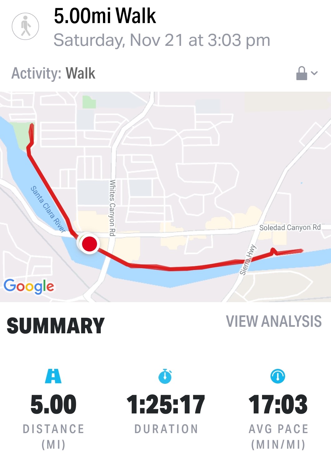 Nov 20 – Today was my second 5K in the Run Santa Clarita! Virtual Run Series. I dedicated it to my friend Ann.