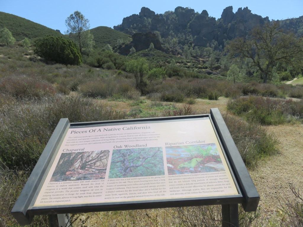 - Pinnacles’ diverse species also include over 48 mammal species; some 400 species of bees (highest density/unit area on earth); 70 butterfly species; 14 snake species (we saw one), around 290 lichen; 50 shrub species; and some 90 wildflowers commonly found in the park.