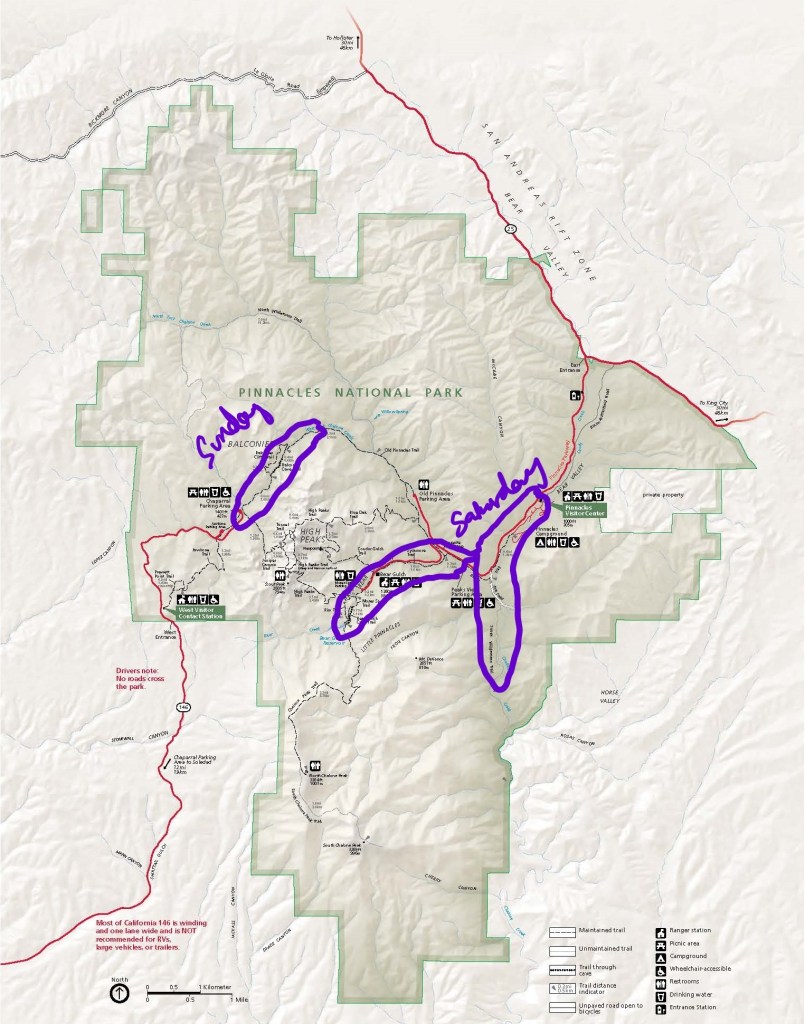 I have much to do and too little optimal time, so this post will be briefer than I would typically do for this type of trip. We decided on the visit to Pinnacles National Park less than a week before we took off. None of our other regular hiking friends could make it so it was just JT and I. Pinnacles National Park is about 4 ½ hours’ drive from our location. We left Friday evening and returned Sunday. It was relatively last minute so we decide to hotel it rather than camp. However, having seen the campground (tent ‘cabins’ and regular tent camping) on our hike, we’ll likely return to camp. This was a weekend worthy of celebrating National Park Week which started Saturday, April 17th and will end April 25th. Today, Thursday April 22nd, is Earth Day 💚🌎. Special note, I was born on a Thursday 😁.