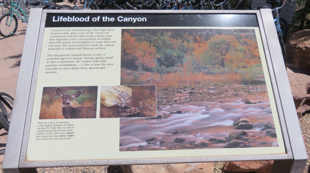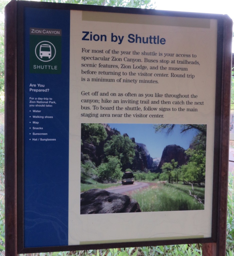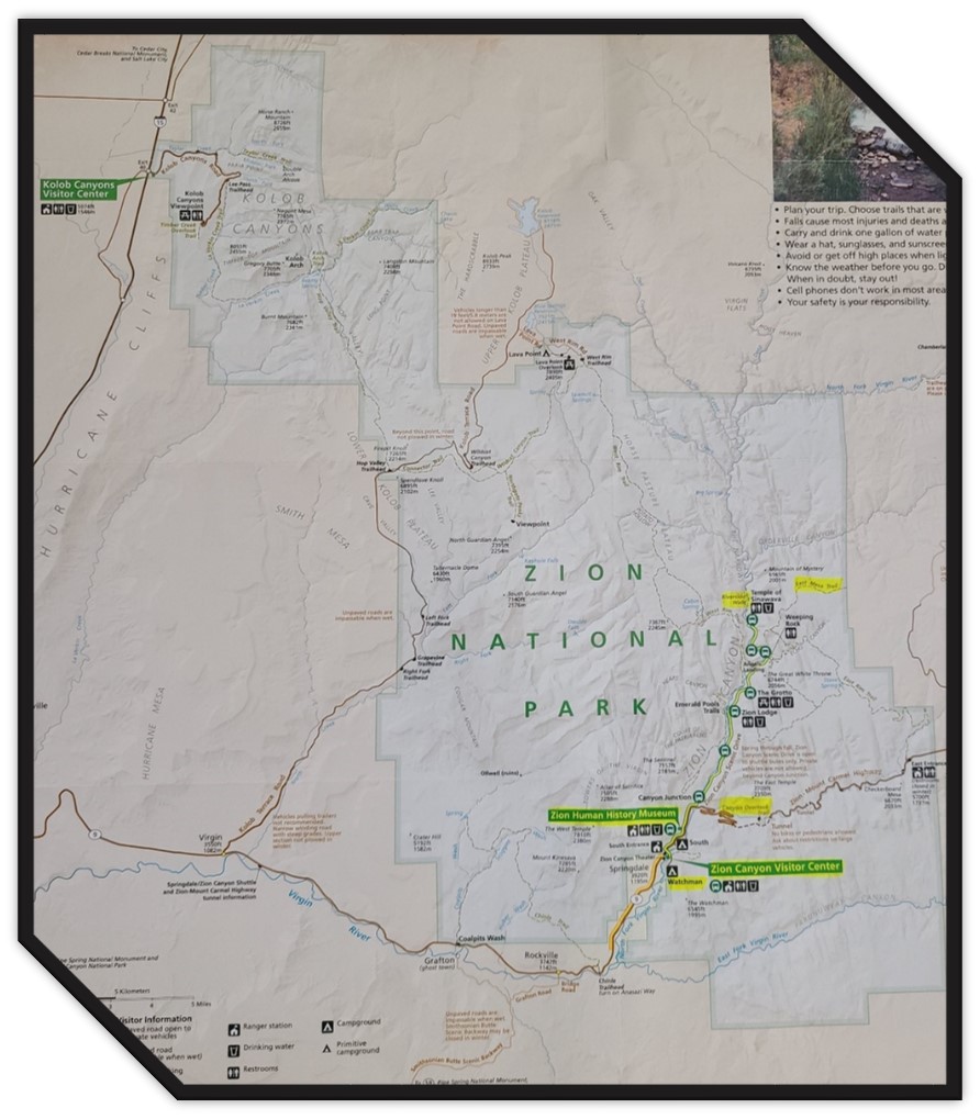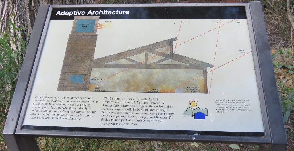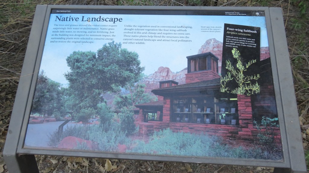 Some 3,591,254 visited Zion in 2020 and while that number is lower than previous years, it is still significant. With that level of visitation Zion ranked 13th of all NPS units and 3rd of all national parks. Visitation is forecast to increase in 2021 and I’ll be included in the count. My first trip to Zion (is it more difficult to pronounce the Paiute word ‘Mukuntuweap’ than it is to pronounce Pennsylvania, Roosevelt, or Afghanistan?) National Park. Two days of hiking. Five trails (see map above). Excellent interpretation around the visitor center. An engaging park ranger whose ‘Ranger Talk’ on the patio focused on the human history of Zion: from the earliest known dwellers to those who operate and use it today. A shuttle service within Zion Canyon that’s been in place for over 20 years, not only reducing congestion on the main scenic road in Zion Canyon, but reducing GHG emissions within the park. Ride said shuttle along Zion Canyon Scenic Drive from the Visitor Center to the Temple of Sinawava. Sustainable building. Splendid landscapes and great conversation.