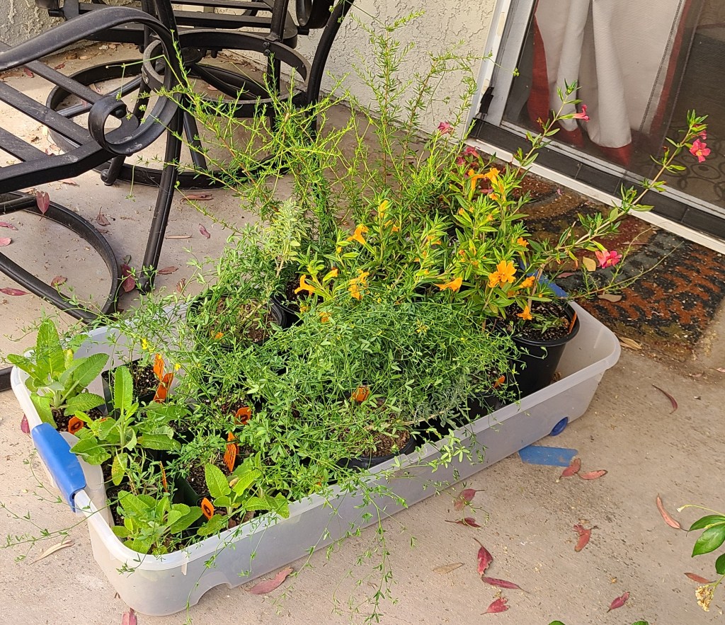 My haul: Hummingbird Sage (Salvia spathacea), Narrow Leaf Milkweed (Asclepias fascicularis), Deerweed (Acmispon glaber), Bladderpod (Peritoma arborea), Dana Point California Buckwheat (Eriogonum fasciculatum ‘Dana Point’), Jelly Bean Orange Monkeyflower (Diplacus ‘Jelly Bean Orange’), and Trish Monkeyflower (Diplacus ‘Trish’).