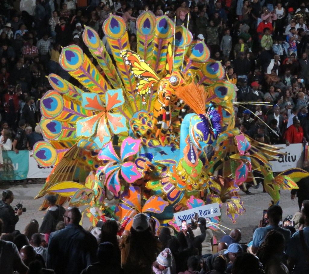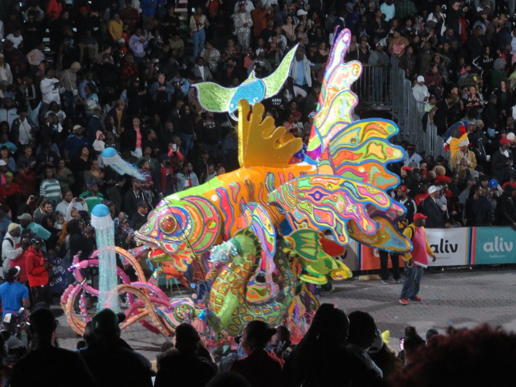 On Boxing Day and New Year’s Day, Junkanoo starts at midnight, my kinda time. It’s an awesome display of creativity, craftmanship, artistry, colour, vibrance musicianship (especially with the cowbells, you can guess why my video is sometimes shaky), stamina (they carry the floats, they’re not on trucks), etc.. Group (not band) members paste their own costumes and this can be a year-round activity. You can’t simply go to a group shack and buy a costume to join the parade. I love that!