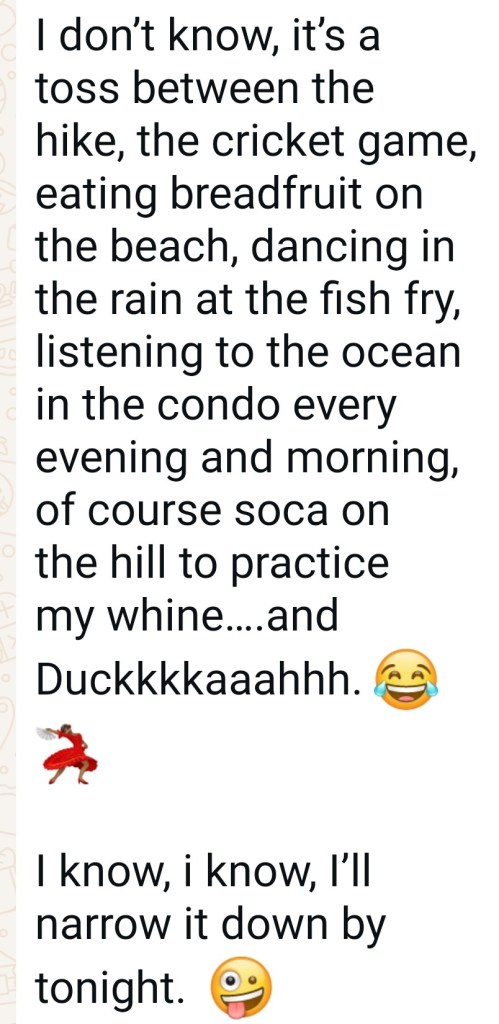 Note to self. When writing, listening to soca is great; it drives creativity and flow of thought. But not great, or at least questionable, because it also drives flow of waist and hips, thereby lengthening writing time. Writing and wukking – two life long pursuits! Uh gone!
